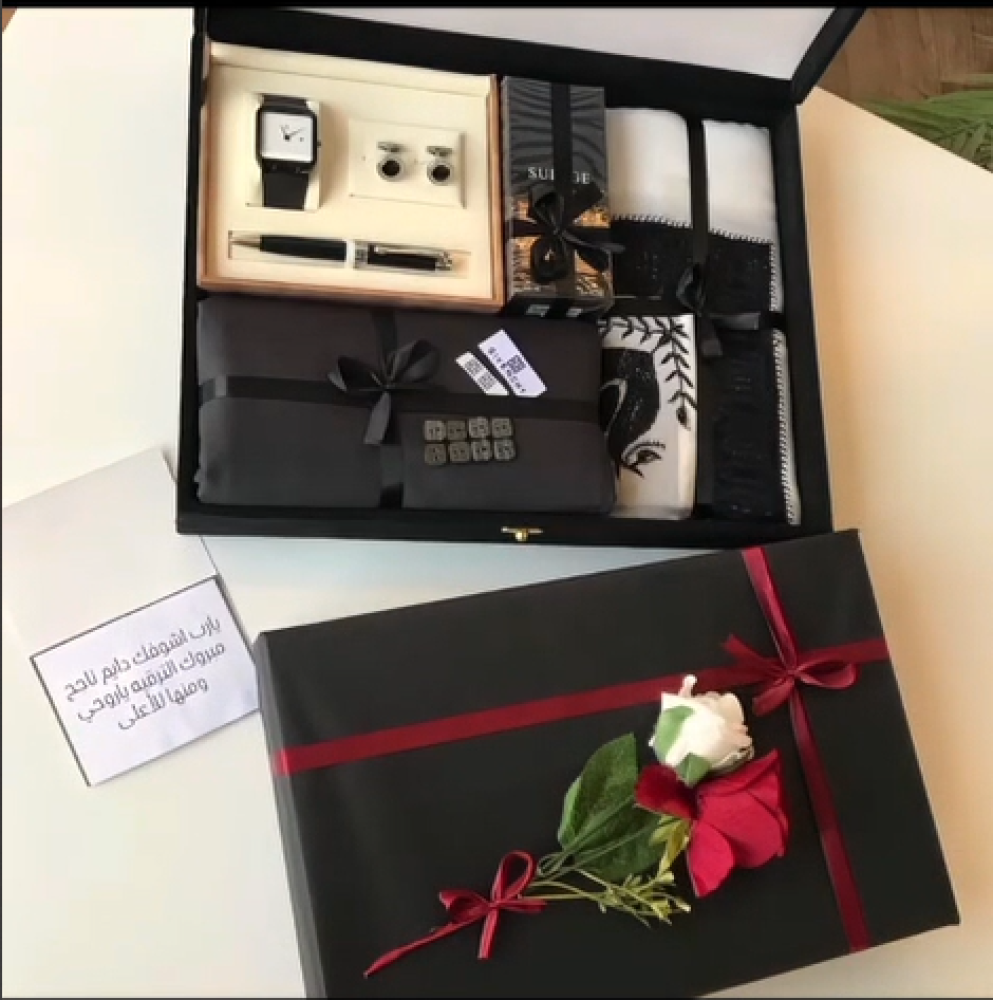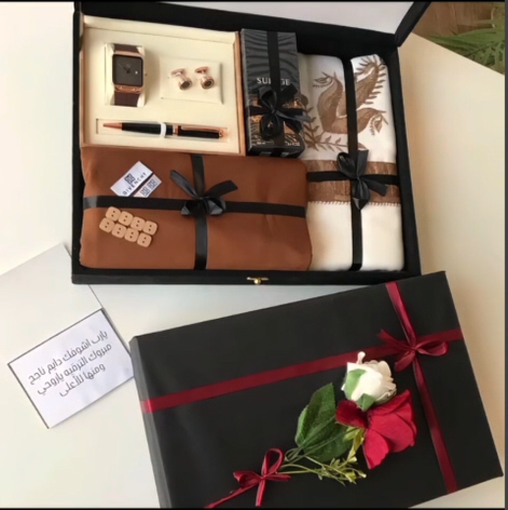 - طقم راقٍ يضم ساعة فخمة، كبك، وقلم مميز.